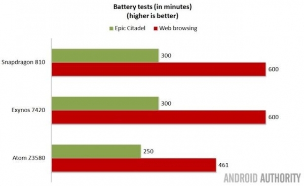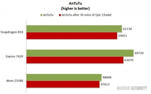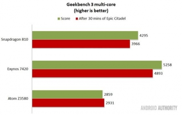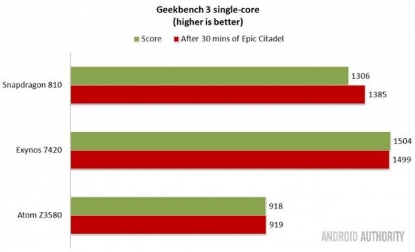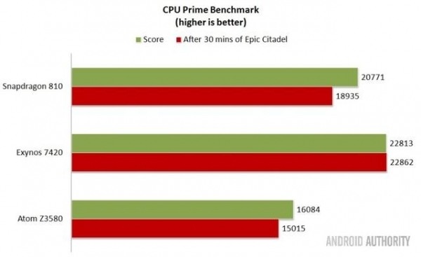 CPU Prime的结果和之前的测试类似,不过值得注意的是,骁龙810和Z3580在进行10分钟的视频录制后再次接受测试会出现性能下降,而Exynos 7420则基本不受影响。
