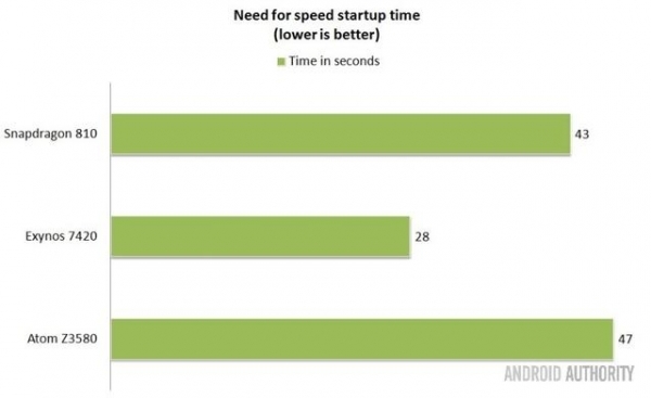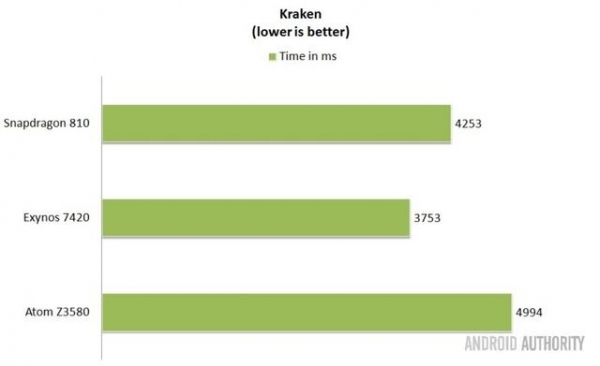 这一环节的测试包含亮相内容,分别是开启《Need For Speed No Limits》游戏的时间和Kraken JavaScript跑分。Kraken是由Mozilla所开发的跑分工具,用于测量手机在运行真实应用时的速度表现。从下图中可以看出,Exynos 7420在两项测试中的表现最好,Z3580垫底。