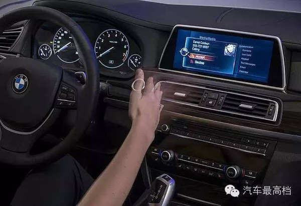 新一代7系的iDrive系统已经具备了手势识别功能,让驾驶者可以透过简单的手势、不需直接触摸触控屏幕,就能完成调整音响音量或接听电话等操控,带来全新的多媒体系统使用体验。而宝马将在这次CES展中展示的AirTouch则可通过更人性化的手势就能控制导航系统、影音娱乐和通讯装置,内置的感知器会在中控台及车内后视镜之间的这个区域,辨识驾驶者的手部动作,让驾驶者的手看起来像是在点击屏幕,却不需要直接碰触到屏幕就能完成各项指令。