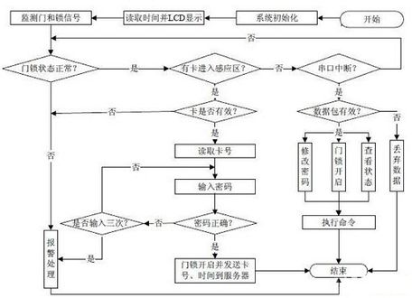 电子密码锁系统的程序包括:MFRC530 对非接触式IC 卡的操作程序、MCU与MFRC530 通信中断处理程序、读写时钟芯片DS1305 及LCD 液晶显示程序、检测门和锁状态程序及 存储器读写程序等。电子密码锁主程序流程图如图3 所示。