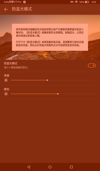 防蓝光模式是Kindle Fire针对IPS屏久看伤眼的特性所作出的特定模式,通过调节平板的背光色彩,将屏幕设置成暖色系,减少光线对眼睛的刺激,尽可能的做到舒适的阅读体验。当然,这项功能虽然看起来噱头十足,但和iPad一般的阅读APP更换背景颜色大同小异,长时间阅读还是要做到劳逸结合为好。