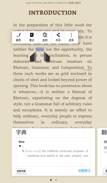 亚马逊阅读器一直都有单词查询功能,Kindle Fire也不例外。通过可自行下载的英汉、汉英、英英等多本词典,用户在阅读英文书籍的时候可以直接点击查询词义。