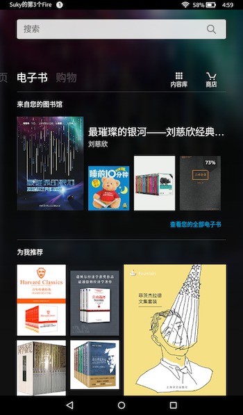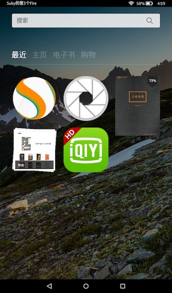 Fire OS的主界面被清晰的标注为四个部分,其中最左侧为“最近”,主要用来显示近期使用的APP以及近期看过的电子书。
