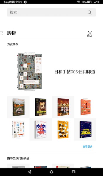 “购物”界面则是一个简化版的亚马逊商城,这里不仅直观的提供了电子书的购买链接,更可以查看亚马逊其他品类的商品。