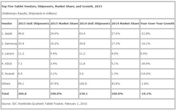 2015年全球平板电脑销量大跌,华为亚马逊逆市而上