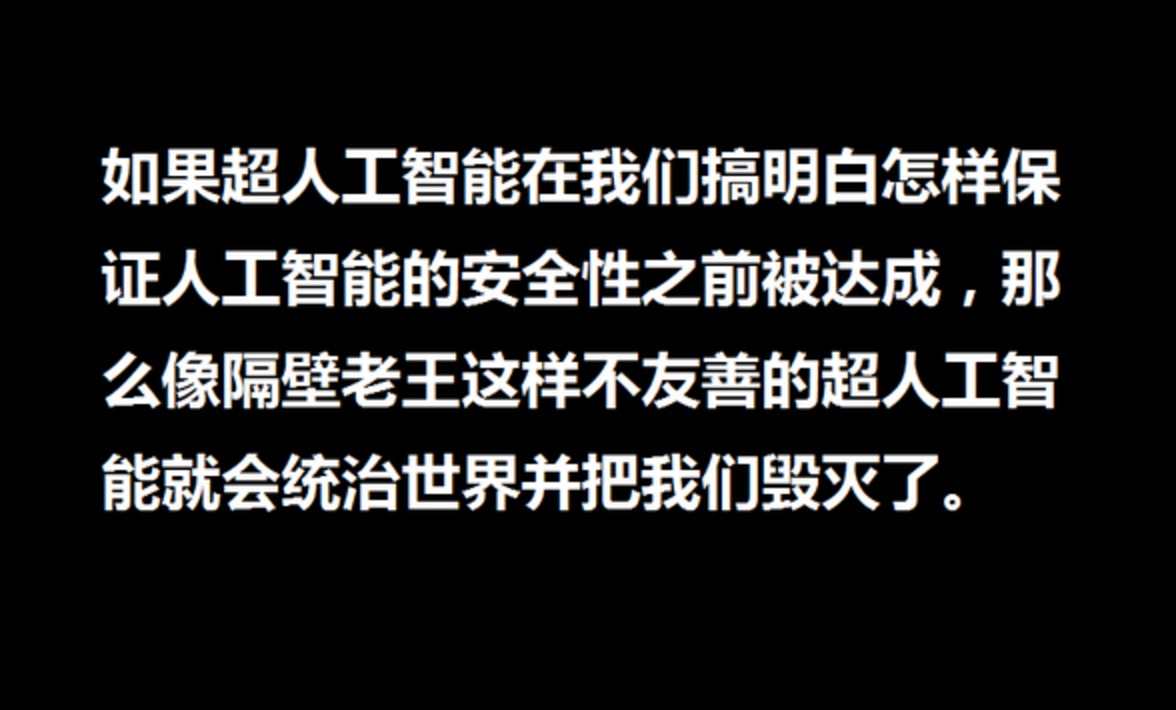 但是如果事情走向了另一面如果超人工智能在我们搞明白怎样保证人工智能的安全性之前被达成,那么像隔壁老王这样不友善的超人工智能就会统治世界并把我们毁灭了。