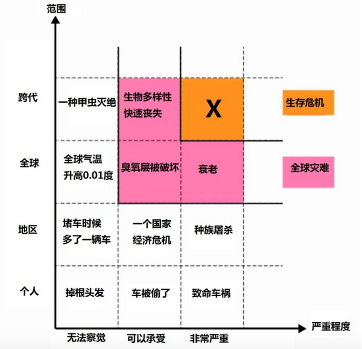 可以看到,生存危机是用来指那些跨物种、跨代(永久伤害)并且有严重后果的事情。它可以包括人类遭受永久苦难的情况,但是这基本上和灭绝没差了。三类事情可能造成人类的生存危机: