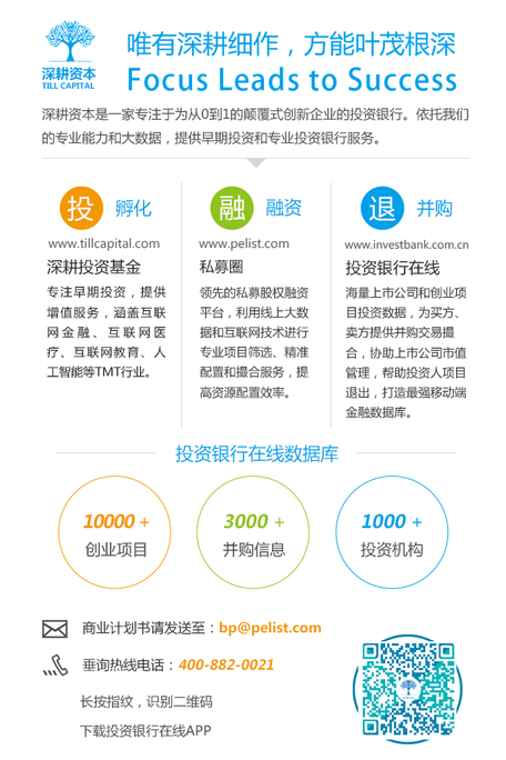 "投资银行在线"是一个资本与项目对接的互联网金融平台,围绕“早期投资、私募股权融资、项目并购退出”提供一站式金融服务。如果您有靠谱的项目,请将商业计划书发送到: bp@pelist.com,垂询热线:400-882-0021。