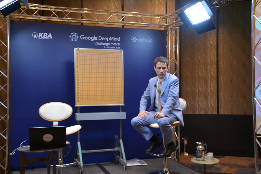 3月9日,韩国世界冠军李世石九段与谷歌AlphaGo对抗赛即将在韩国的四季酒店打响。比赛前现场气氛就非常紧张。图为英文解说麦克雷蒙。
