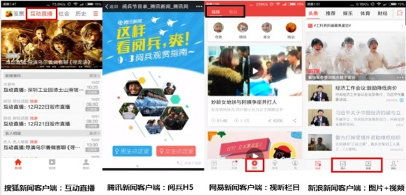 搜狐新闻客户端在4.3.1版本中首推新闻直播间模式。腾讯新闻客户端在2014年首发试水客户端上的H5。网易新闻客户端5.0版本中推出“视听”栏目,接入视频和电台。新闻客户端在2015年新版本中首次实现了“五位一体”的媒体形式,包括文字、图集、视频及延伸阅读的超链接。