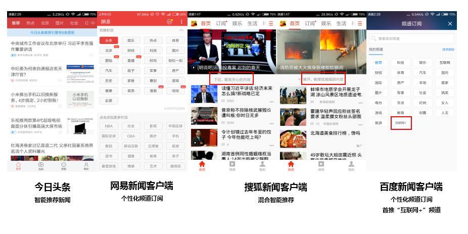 之后网易新闻客户端在更新的4.0版中推出智能定制和个性化推荐。搜狐新闻客户端在4.0版,提出新闻客户端“个性化”,采用大数据算法推荐新闻资讯的模式,5.0版加入了编辑精选和用户订阅两方面的功能,首推混合智能推荐。