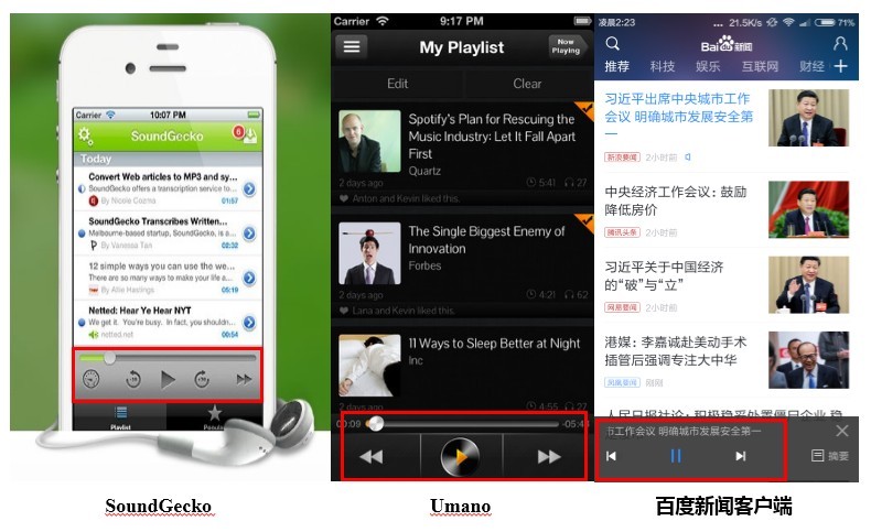 之后,美国一家创业公司SoThree于2013年推出一款新应用Umano,能朗读出应用内的文章内容,使用户在驾车或健身时也能了解新闻。Umano利用算法和编辑推荐,每天向用户提供录制的新闻。该应用创始人指出,开发Umano是为了帮助给用户提供一种不同的新闻消费方式,方便用户外出时消费新闻。