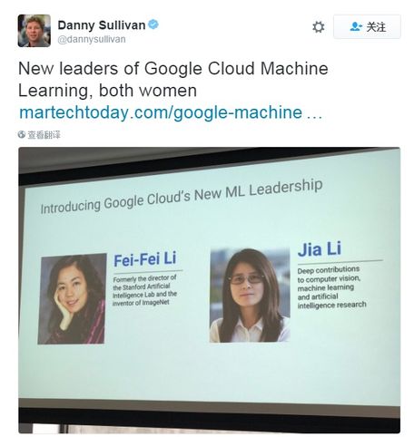 谷歌周二在旧金山召开的新闻发布会上宣布,斯坦福大学人工智能实验室主任李飞飞和热门社交消息应用Snapchat的母公司Snap的研发主管李佳已经加盟公司并将领导谷歌云计算集团旗下新成立的机器学习部门。机器学习是人工智能的一个分支,指的是训练计算机在海量数据中识别特定模式。