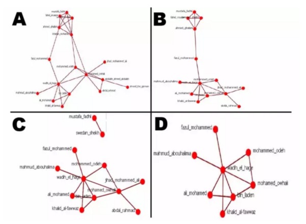 上图是他们的一个例子:坦桑尼亚网络的节点被贪婪启发式搜索去除后的可视化表现。图A是初始网络,图B去除了3个节点,图C去除了5个节点,图D去除了9个节点。随着去除的节点越来越多,图形变得越来越像星形。当去除11个节点后,拓扑结构就完全像一个星形了。