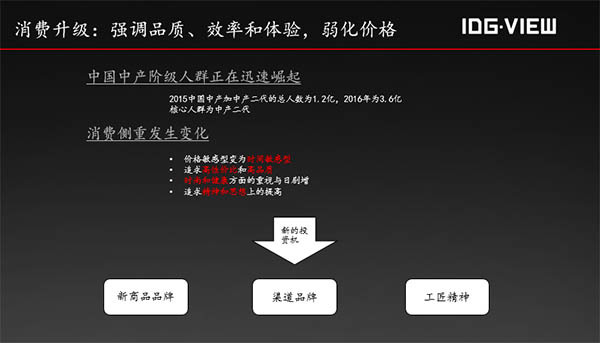 从目标用户上看,消费升级主要针对的是中产人群和伪中产人群,归结到几个关键点:一是强调品质;二是强调效率;三是强调体验。
