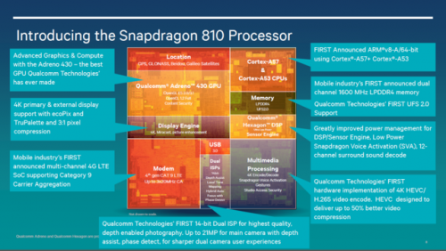 骁龙810为了快速向64位过渡暂时放弃了自主架构,采用Cortex-A57+Cortex-A53这样的组合,分管大小任务,中间采用CCI-400互联;除此之外,骁龙810还采用了新一代Adreno 430 GPU,相比上一代性能提升30%。Adreno 430运行频率为最高600MHz,与骁龙805当中的Adreno 420相同。