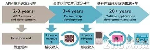 接下来我们简单的介绍下ARM处理器的设计及授权周期,ARM主要做的是高效率、低功耗芯片(微处理器)架构研究开发,通常2-3年的周期,这也是 ARM成本产生阶段,然后选择ARM为合作伙伴的公司支付一笔入门的授权费获得设计方案,并基于ARM方案开发自己的产品,通常周期3-4年,再然后当合作伙伴的芯片开始出货时,ARM能够从每一片基于其架构的芯片获得1-2%的版税,而每一款ARM设计方案都适应于多种终端应用,每一种应用又能获得多年的版税现金流,规模效应显著。
