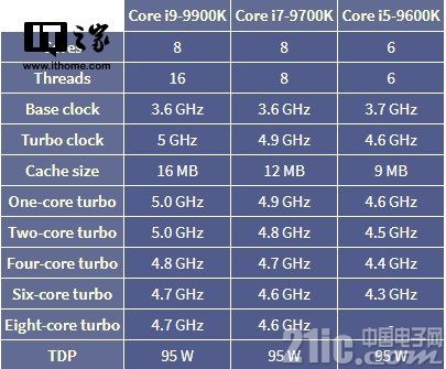[导读]从图中可以看出,规格最高的i9-9900K,拥有8核16线程,单核睿频可达5GHz,8核火力全开,睿频可达4.7GHz。而主流消费级的i5-9600K,也达到了6核6线程,单核睿频最高可达4.6GHz,6核睿频尚不得知。