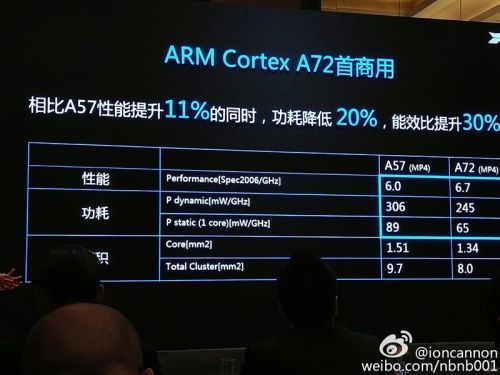华为宣称,A72核心相比于A53核心的性能可以提升大约11%,同时动态功耗降低20%,静态功耗降低27%,而且借助新工艺核心面积更小。