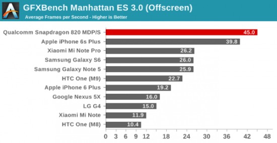 即便是与苹果手机芯片 A9 相比 Snapdragon 820 也依然出色,特别是在 GPU 性能上更好。最近一些早期未进行软硬优化的 Snapdragon 820 原型样机,通过基准测试也证实了这一点。其中 Adreno 530 性能要比 A9 的PowerVR GT7600 性能高出大约 10%。特别是在 GFXBench 3.0 曼哈顿离屏测试中,Adreno 530 可以跑出 45.2FPS 的帧率,相比之下 iPhone 6S 的成绩是 39FPS,高通领先多达16%。