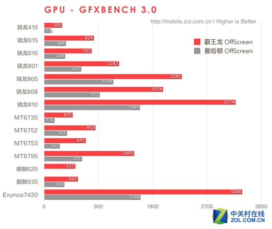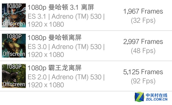 另一项图形测试GFXBench上,T-Rex Offscreen骁龙820也相比去年的旗舰平台有将近100%的性能提升,曼哈顿Offscreen也有60%左右的性能提升。