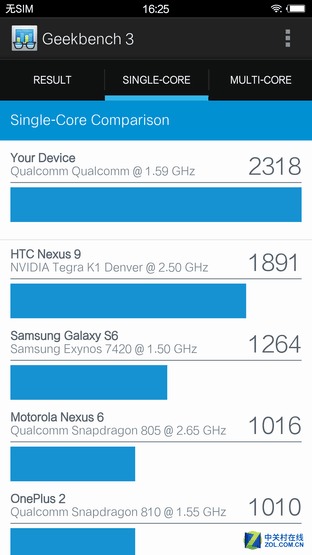 GeekBench 3.0采用对单核心和多核心分别的方式对CPU性能进行测试,主要衡量CPU和内存的运算能力,得分分四个大项--整数运算、浮点运算、内存性能以及内存带宽性能。作为对比,苹果A9处理器的单线程成绩为2576,多线程达到了4478。