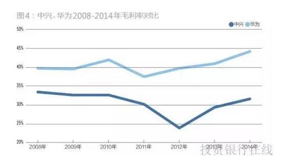 从二者2008-2014年间的整体毛利率看,中兴全面低于华为。二者的毛利率变化趋势大致相同,但华为是处于微升状态而中兴是微跌状态。从具体数额看,中兴的整体毛利率较华为最小差距为2008年的6.28个百分点,最大差距为2012年的15.9个百分点(图4)。
