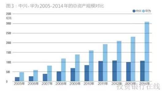 总资产规模比值从2.13倍提高至2.92倍。华为官网发布的年报未披露其2004年前的总资产情况。就2005-2014年间的比较来看,中兴与华为的总资产规模差距从246.54亿元扩大至2035.59亿元;二者总资产规模比例从2.13倍至2.92倍(图3)。