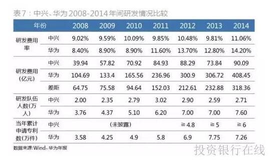 另外,考察中兴、华为的研发情况,中兴近年的研发费用率约为10%,保持相对平稳。2011年以前,华为的研发费用率低于中兴,2011年开始华为高于中兴,且呈现逐步上升的趋势(表7)。