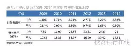 进一步考察两家公司的财务费用率指标,尽管中兴比华为的规模更小,但中兴的财务费用率明显高于华为(表6)。这与前文所示的现金流量表反映情况是一致的。虽然华为规模庞大,但是连年保持充裕的现金流。如2009年,华为的财务费用为-12.55亿元,这意味着不仅无财务费用,还存在利息收益。