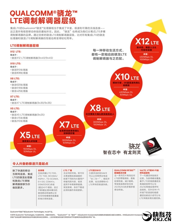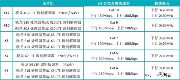 - X8 LTE:骁龙620/618/425,整合基带,Cat.7,300/100Mbps