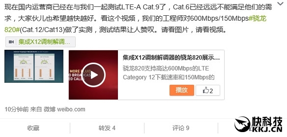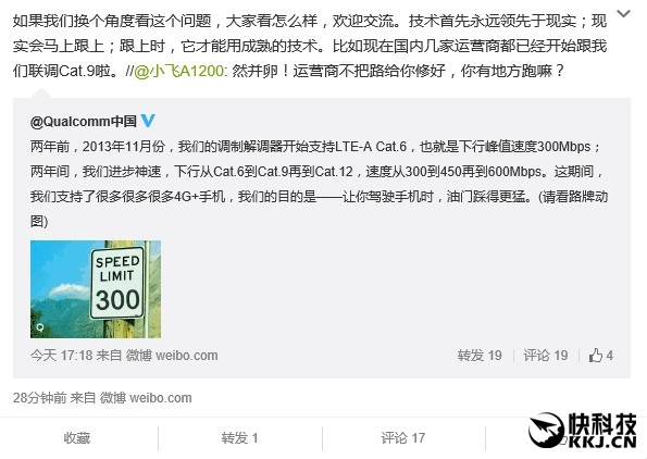 但高通对此看法不同,并在官方微博公开表示,技术首先永远领先于现实,现实会马上跟上。跟上时,它才能用成熟的技术。比如现在国内几家运营商都已经开始跟我们联调Cat.9了。