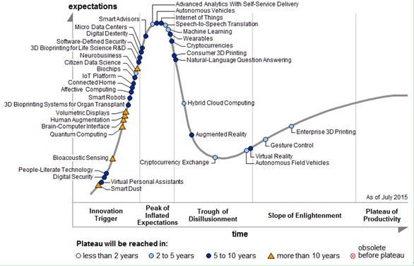 笔者:世界知名信息技术研究和分析机构Gartner发布《2015年度新兴技术成熟度曲线报告》,评估了112个领域超过2000项新兴技术的市场类型、成熟度、商业应用及未来发展。按照gartner新兴技术成熟度曲线图,石墨烯现在处于哪个阶段?