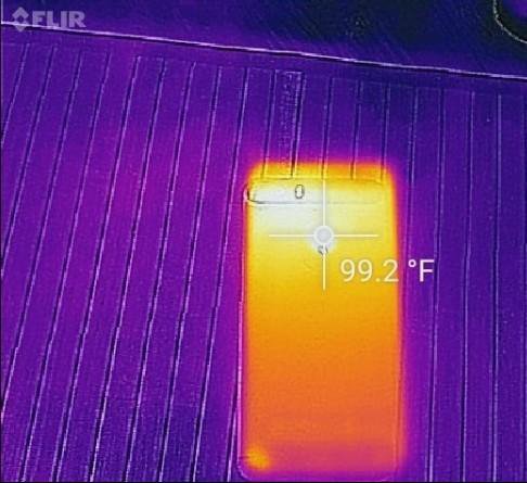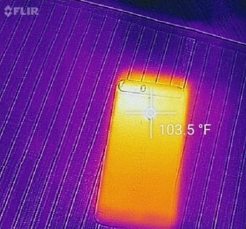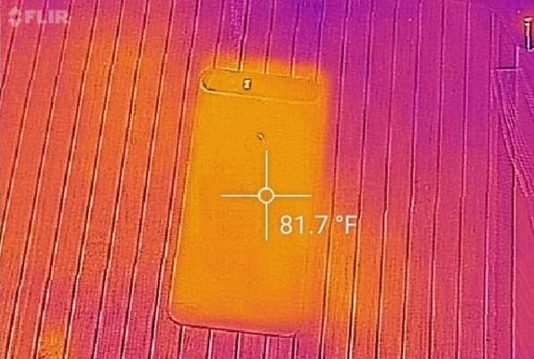 测试过程记录了 Nexus 6P 的开机温度,约 27.2 度,当时室温约 24.4 度;之后静置半小时,中间不进行任何操作,再拿起手机使用 10 分钟,分上网 5 分钟,玩《滑雪大冒险 2》 (Ski Safari 2)5 分钟,Flir 热成像相机记录的 Nexus 6P 温度为 37.3 度。同时,成像显示,热量主要集中在摄像头和指纹传感器间。