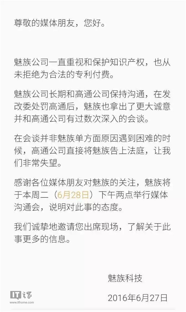 同时魅族还在回应中表示,将于本周二(6月28日)下午两点举行媒体沟通会,说明对此事的态度。