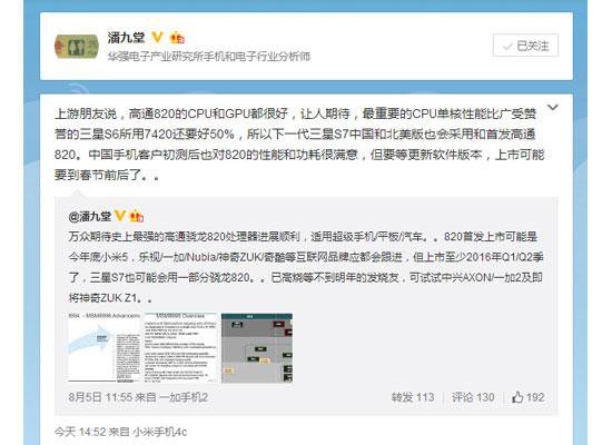 而现在根据电子行业分析师潘九堂曝料称,高通820的CPU和GPU都很好,让人期待,最重要的CPU单核性能比广受赞誉的三星S6所用7420还要好50%,所以下一代三星S7中国和北美版也会采用和首发高通820。