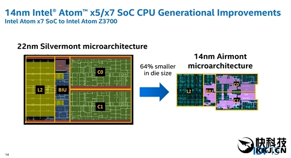 新一代Atom x7/x5的最关键之一变化就是制造工艺从22nm升级到了14nm,与桌面级产品完全相同,而新工艺的好处大家都明白:更高的性能、更低的功耗、更小的面积。按照Intel官方的说法,核心面积这次减小了足足64%!