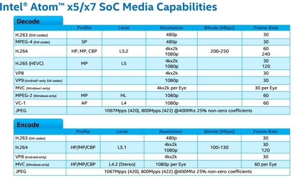 多媒体方面支持4K级别的H.264、H.265、VP8视频格式硬件解码,以及1080p VP9、MPEG-2、VC-1硬件解码,同时支持4K H.264、VP8硬件编码,但具体情况还要看系统是Windows还是Android,两者略有不同,但是满足日常娱乐需求是绰绰有余的。