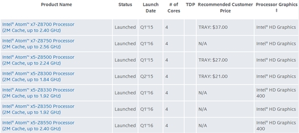 Atom x7/x5系列迄今已经有七款型号,其中编号末尾00的三款是2015年3月份首发的,已经有不少产品陆续采纳,另外编号末尾50/30的四款则是2016年2月份新增的,均暂未看到实际产品。