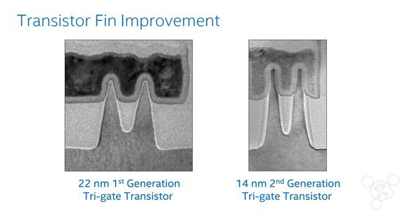 英特尔22纳米和14纳米晶体管鳍片细节对比: