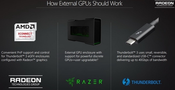 今日,AMD发布了自主研发的外置显卡解决方案XConnect,令人感到有趣的是,AMD的解决方案采用了Intel研发的雷电3接口。