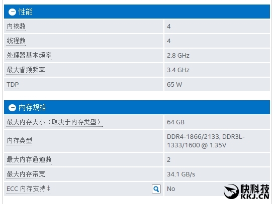 规格方面,i5-6402P四核心四线程设计,主频2.8GHz,动态加速最高3.4GHz,三级缓存6MB,TDP为65W。