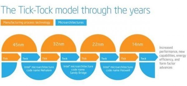 在Broadwell之前,Intel一直严格遵循Tick-Tock发展战略周期,每一次“Tick”代表着微处理器架构的芯片制程得到提升;而每一次“Tock”则代表着在新一代芯片制程的基础上,对微处理器的架构进行升级。