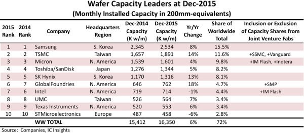 2015年全球半导体产能统计:三星称霸,GF逆袭Intel