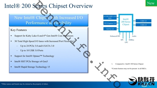 好消息是,200系列不止是改个名字那么简单了,新特性还是比较多的,比如说HSIO高速输入输出通道从26条增至30条,多出来的四条属于PCI-E,功能完整,还会用来支持Intel Optane,也就是3DX Point混合存储技术。