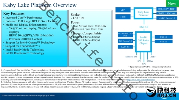 Kaby Lake将维持Skylake LGA1151封装接口,提供发烧四核95W、主流四核/双核65W/35W等配置。