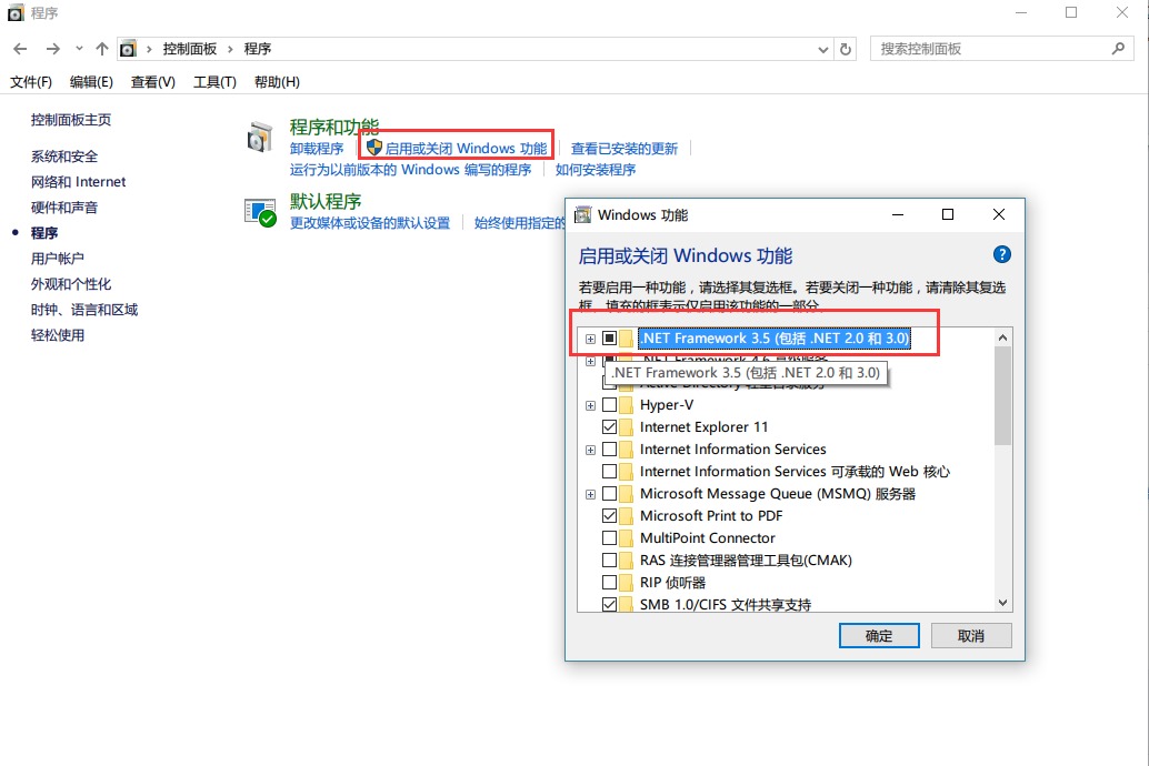 7.待安装完成后,打开“控制面板”,点击“程序”,选择“启用或关闭Windows功能”,勾选“.NET Framework 3.5(包括.NET2.0和3.0)”然后点击确定就行了。