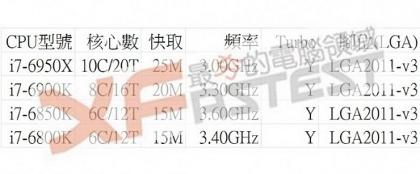 除了 i7-6950X 之外,另外三款 Broadwell 处理器的规格也遭到部分曝光,i7-6900K 采用了 8 核 16 线程的设计,主频为 3.3GHz,拥有 20MB 的三级缓存;而 i7-6850K 和 i7-6800K 则都是 6 核 12 线程,其三级缓存均为 15MB,不过,它们的主频略有差异。