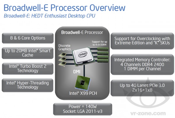 Broadwell 系列将推出 4 款处理器 i7-6950X、i7-6900K、i7-6850K 和 i7-6800K。其中,i7-6950X 是 Extreme 版本,采用 10 核 20 线程的设计,比 i7-5960X 还有多两个核心(16 线程)。