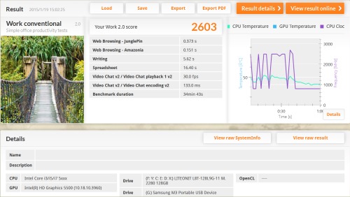全新戴尔XPS 13在PC Mark Work conventional模式下跑出了2603分的成绩,说实话小编刚看到这个成绩的时候也感到非常惊讶。因为作为一款能够轻薄如此的笔记本能有这样的得分确实不易,因为通常来讲,普通笔记本(绝不是轻薄本)的得分大致在2200分左右,所以XPS 13的表现已经令小编非常满意了。